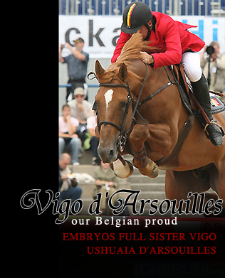 On these pages you can find some top broodmares owned by Belgian breeders. The overview shows the different mares with pictures and more information, on the pages ‘Breeding Program’ you can find the foals that will be expected next. Horse owners and breeders who want to start with the highest quality can find some very good foals for sale on the ‘Sales Page’.Obviously in these pages are not only mares with primeval old Belgian mother lines. The location of Belgium in Europe makes it possible to create the perfect mix in breeding. This mix is the strength and advantage of the Belgian breeding. Remember how Mr. Melchior (founder of Studbook Zangersheide) went to Hannover several decades ago to buy the best mares over there and later cross them with the French stallion Almé Z. This cross-outs mares were later mated with the stallion Ramiro Z. Out of this orginal mix Ratina Z was born, Ratina Z is still known as the best mare ever! Without such an international mix, we would miss a large number of contemporary horses. For example the relevance of the moment, Mylord Carthago; a typical cross between german (Carthago Z) and french (Jalisco B) blood. Or what about the Holsteiner Sieger 2008: Diarado (Diamant de Semilly - Corrado I). It may be clear that these pages contain not only the typical Belgian horses, but simply the best horses Belgium has to offer! You will see some pure bred Holsteiner and Hanoveranian mares such as the full sister to Casiro (Cassini I - Landgraf I) and the mare Cassina (Cassini I - Cor de la Bruyere). We also offer products from various interesting mixes of European studbooks like the mare Jaretelle Z. This is a daughter by Jus de Fontaines with the famous Caletto I mare Roofs. Roofs is without any doubt one of the best mares in the world, under Jan Tops she competed at the highest possible level! From Jaretelle Z we will expect 3 foals by embryo transplantation in 2010. The first of the French-bred stallion stallion Zandor Z (Zeus), the second will be a foal by the stallion Cornet Obolensky (Clinton – Heartbreaker), a from origin Belgian stallion. The third will be a foal by the pure bred Holsteiner stallion Clinton I (Carolus). Another mare on this website is the mare d'Ushuaia d'Arsouilles. This "typically Belgian" mare is none other than the full sister to our Belgian proud Vigo d'Arsouilles who was very successful at the European Championship under Philippe Lejeune. The mare jumped herself in a ‘puissance’ show over a wall of 2m10 on a show in Czech. Vigo d’Arsouilles From this interesting mare you can purchase embryos. You choose your stallion, we create the embryo for you and send you the foal when he is born. Very easy and a very good service, isn’t it? You're looking for a quality broodmare, an elite foal or perhaps a pregnancy by a stallion of your choice? Don’t hesitate to contact us via mail or by telephone! |